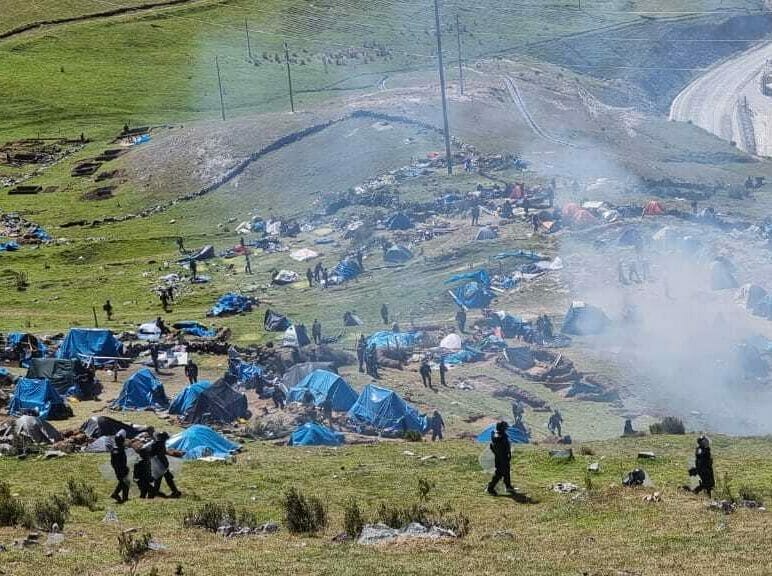 Tras declarar el estado de emergencia, el gobierno desplazó 2500 efectivos policiales y del ejército, que acudieron al terreno de la compañía minera para desalojar a los manifestantes. Desde esta mañana, la represión se ha convertido en un conflicto. Los testigos y los vídeos que han empezado a circular en las redes sociales confirman que los militares han recurrido al utilizo de la violencia.