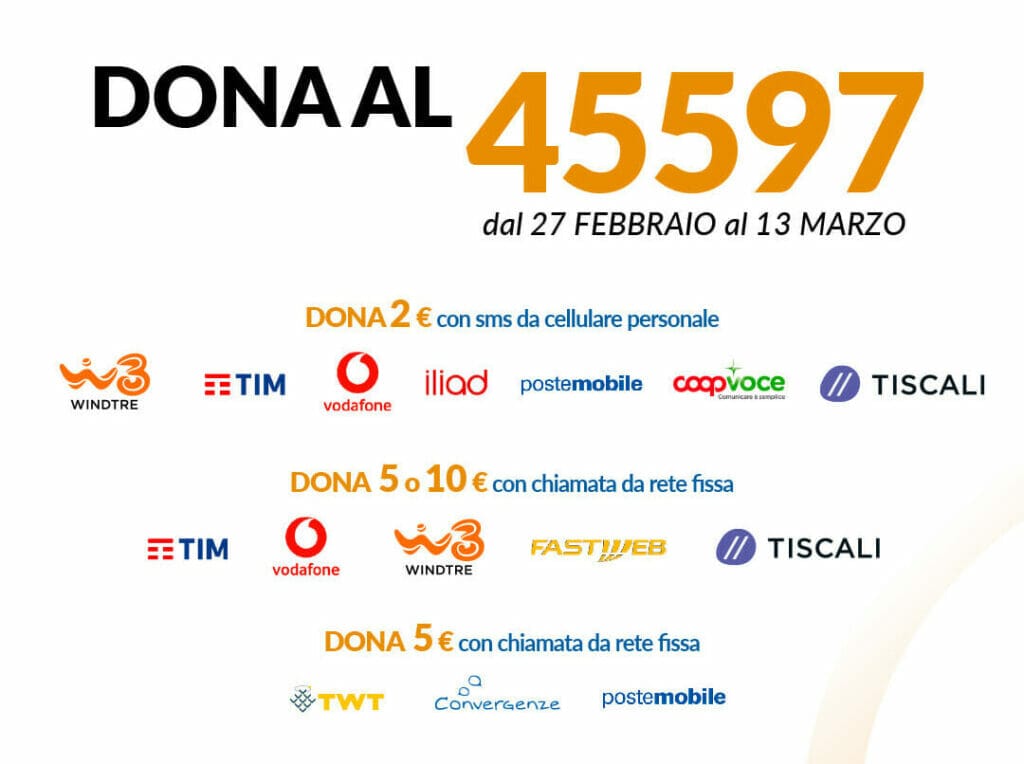 Dal 27 febbraio al 13 marzo è possibile sostenere WeWorld e proteggere i bambini e le bambine dell’Ucraina dagli effetti della guerra e le vittime di violenza in Italia, donando 2 euro con sms al 45597 dai cellulari personali Wind Tre, TIM, Vodafone, Iliad, PosteMobile, Coop Voce, Tiscali o 5 e 10 euro da rete fissa TIM, Vodafone, Wind Tre, Fastweb e Tiscali; 5 euro chiamando lo stesso numero da rete fissa TWT, Convergenze, PosteMobile.