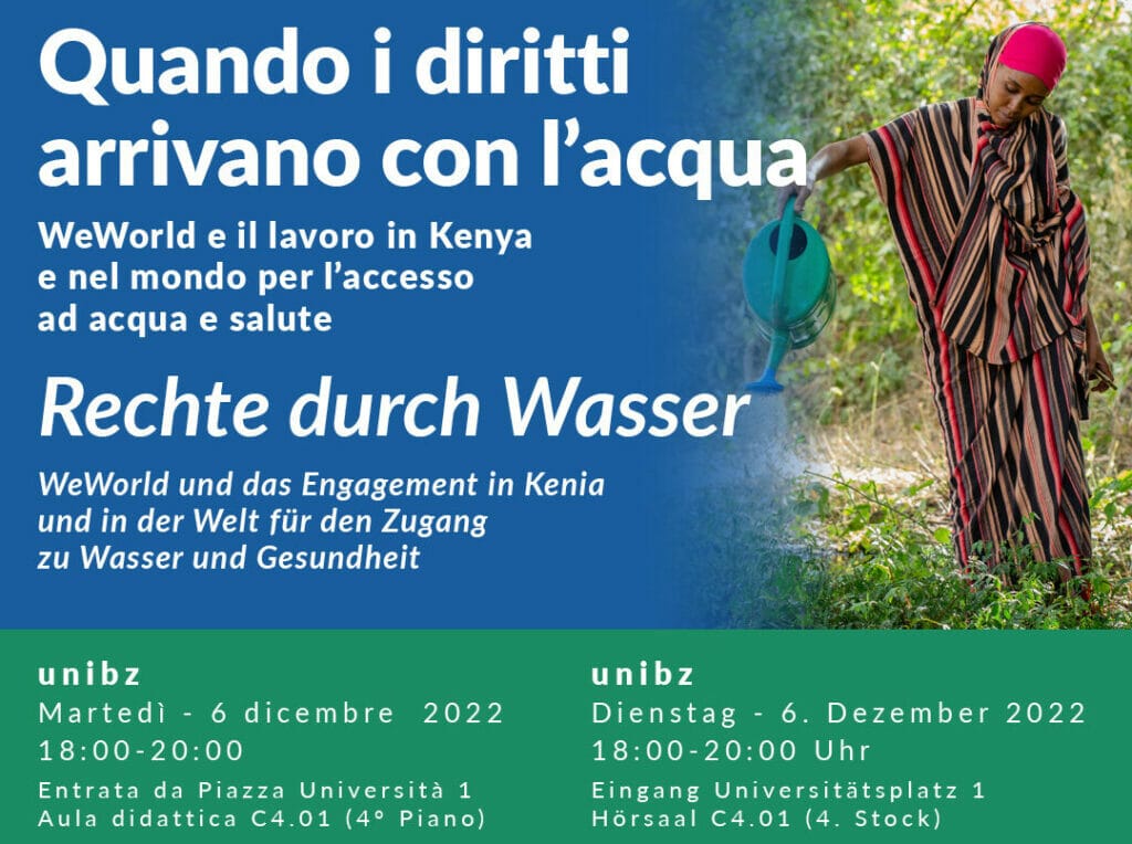 Aprirà l’incontro Franco De Giorgi rappresentante di WeWorld a Bolzano per dare spazio a Carlo Andreotti, professore Facoltà di Scienze e Tecnologie, che interverrà su “Scenari presenti e futuri sull’uso della risorsa idrica in agricoltura”. Seguirà la proiezione del video “Il progetto nella Contea d’Isiolo” con le testimonianze raccolte sul campo e l’intervento di Anna Crescenti, esperta WASH per WeWorld con un focus su “WeWorld e l’emergenza acqua e salute in Kenya”. Le conclusioni saranno di Elisabeth Spergser che racconterà la recente visita in Kenya dove è andata a incontrare le comunità che hanno beneficiato dei nostri interventi sostenuti dalla Provincia Autonoma di Bolzano.