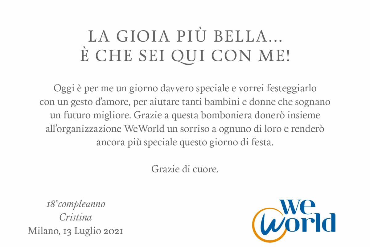 Festeggia il tuo evento speciale con questa pergamena. Lascerai un bellissimo ricordo ai tuoi invitati: il sorriso di bambini e donne in difficoltà che, grazie a questo gesto, avranno un futuro migliore.